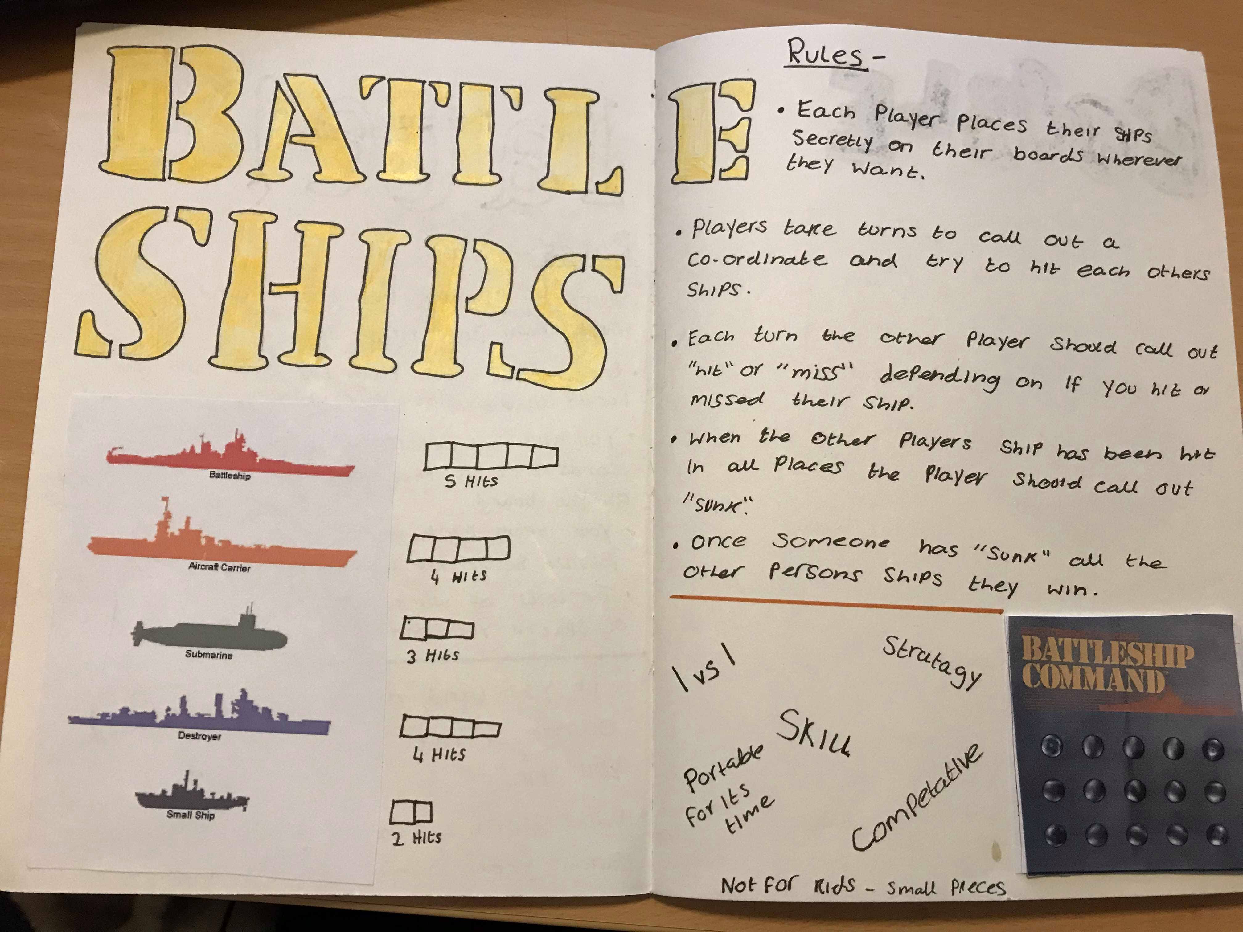 Battleships is a game where you have to try and guess where your opponent has placed their ships on a 10×10 grid. Each player takes a turn at calling out a coordinate which the opposing player will have to say whether they have hit a ship or missed. You can then place an X on your grid to say where you have looked. You continue to take turn and do this until all ships have been hit and sunk (ships are sunk by having the opposing player guess the full location on the ship based on how big the ship is.)